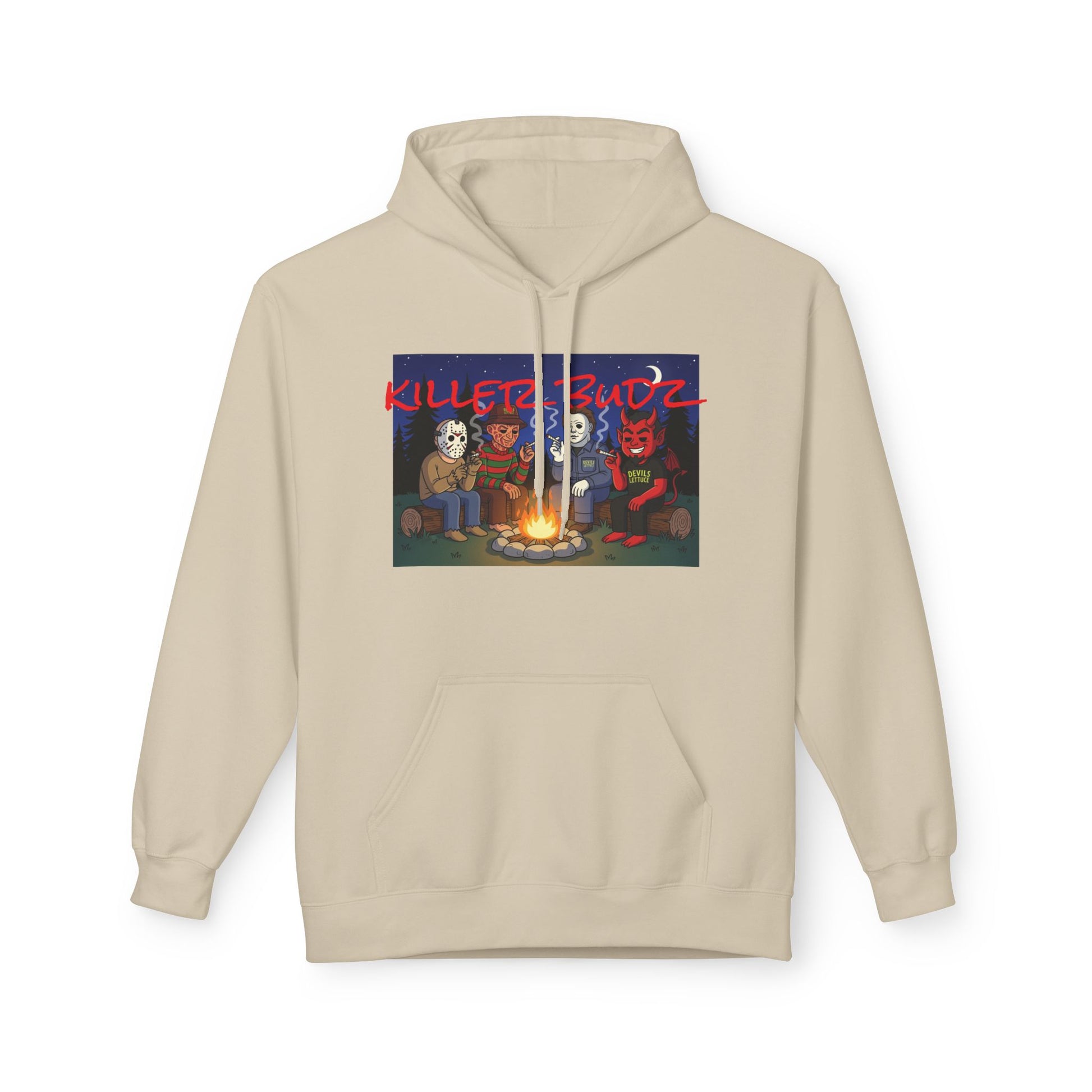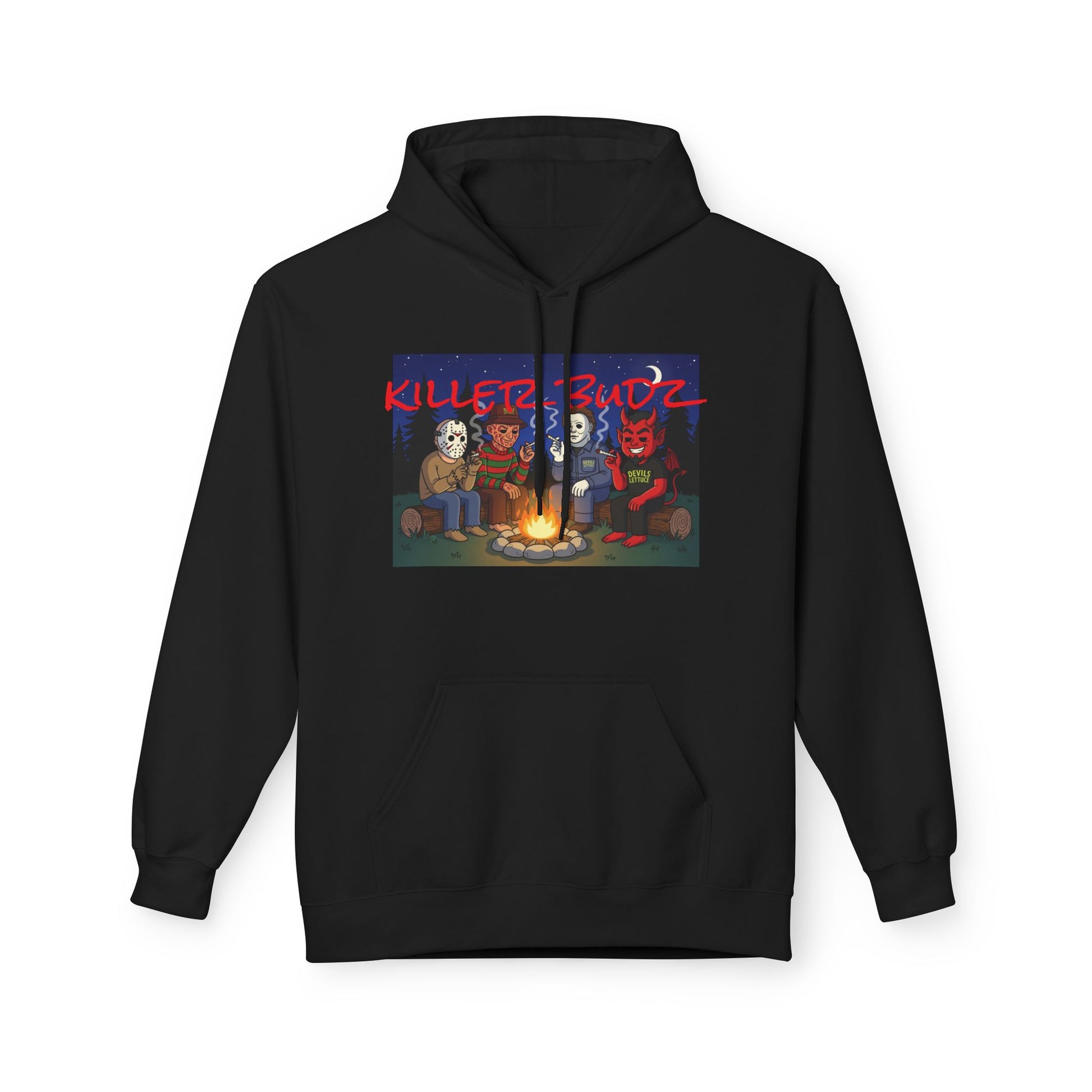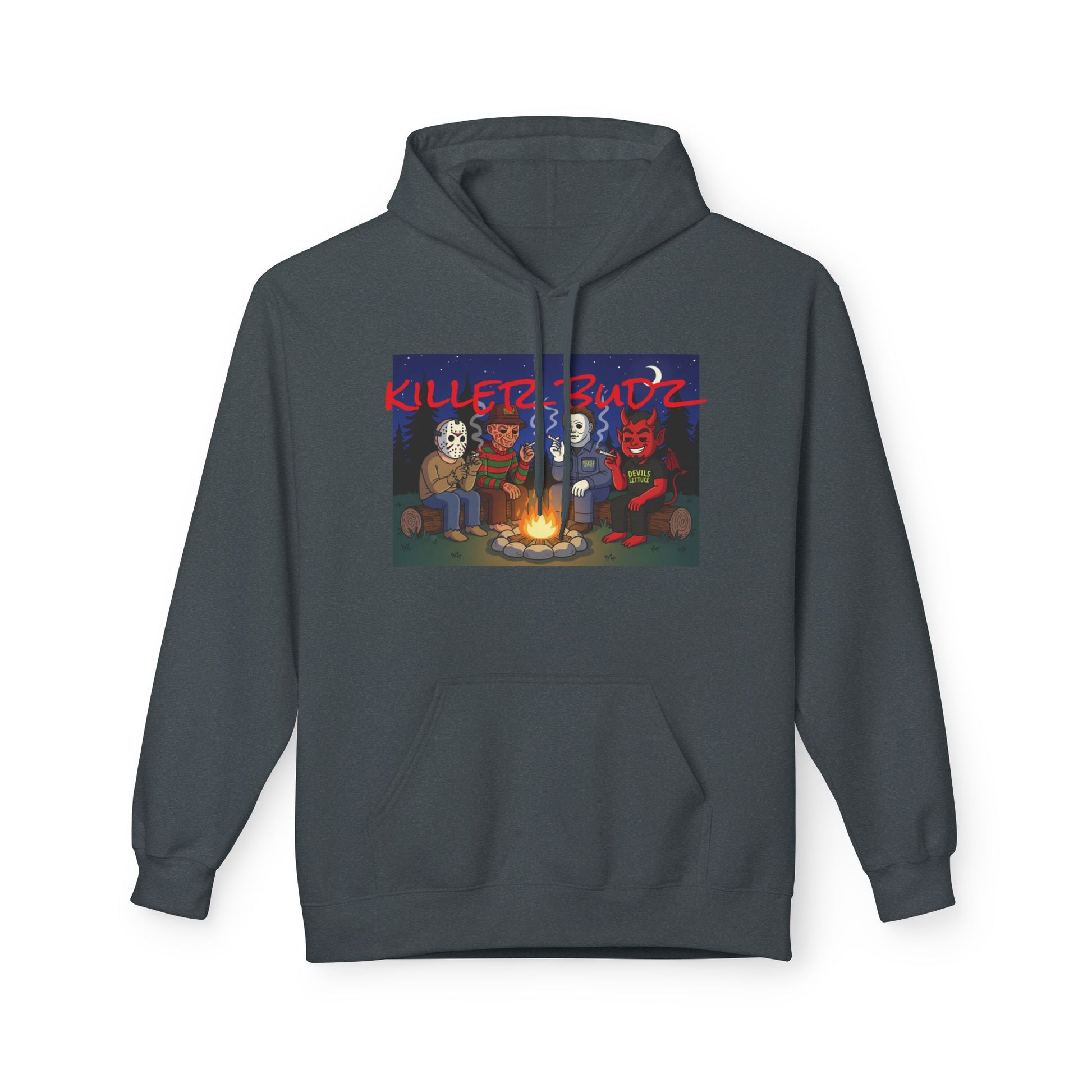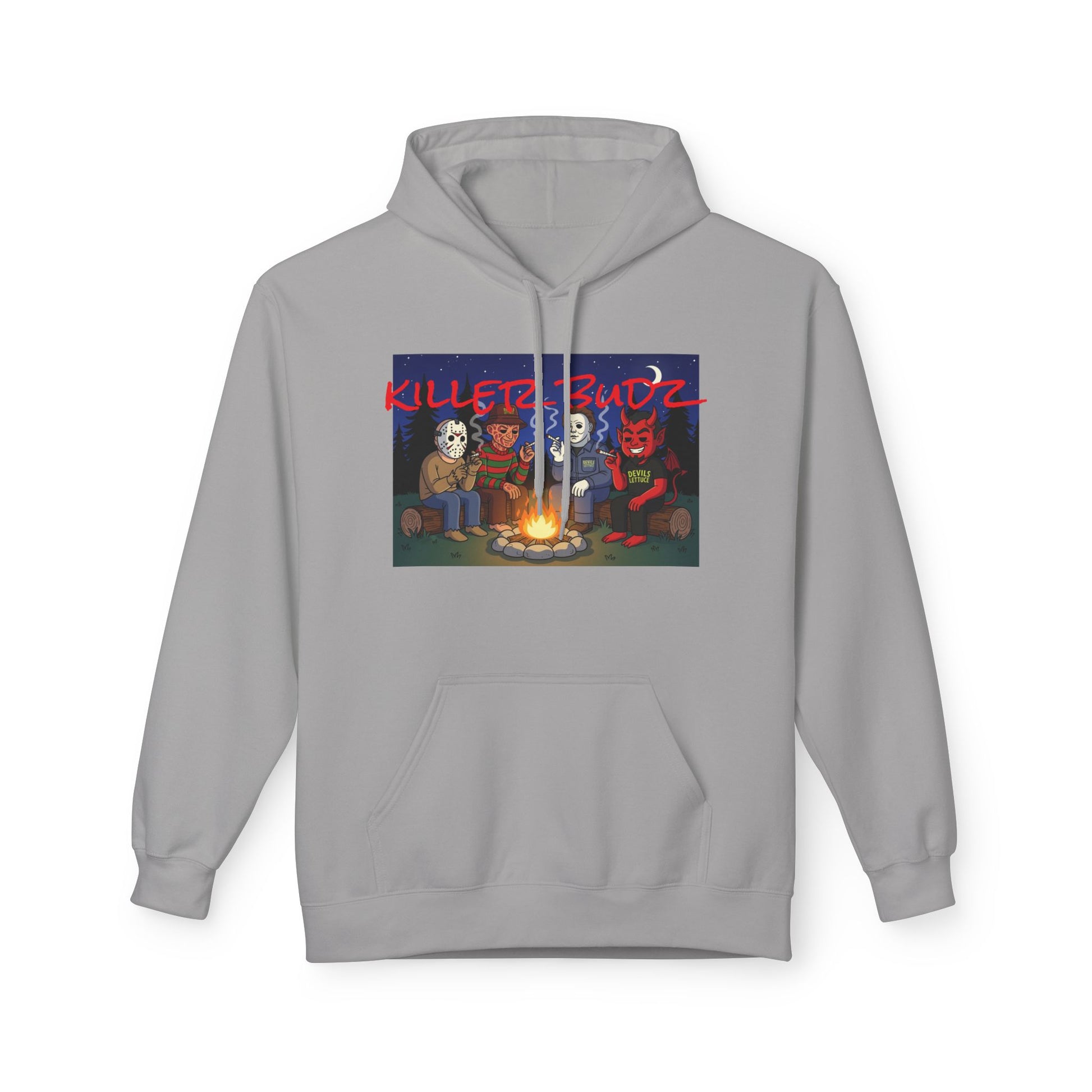 Killer Budz Fleece Hoodie with Devil's Lettuce Print, Unisex Cozy Sweatshirt for Campfire Nights, Halloween Gifts, Streetwear